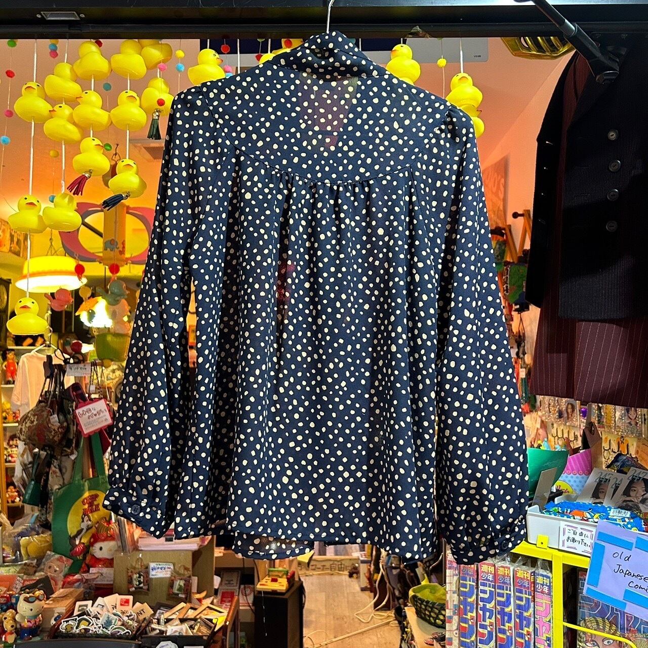 ちょっとカジュアルに、ピアノの発表会にでも使えそうな綺麗な黒のブラウスです。ドットはくすんだ黄色です。